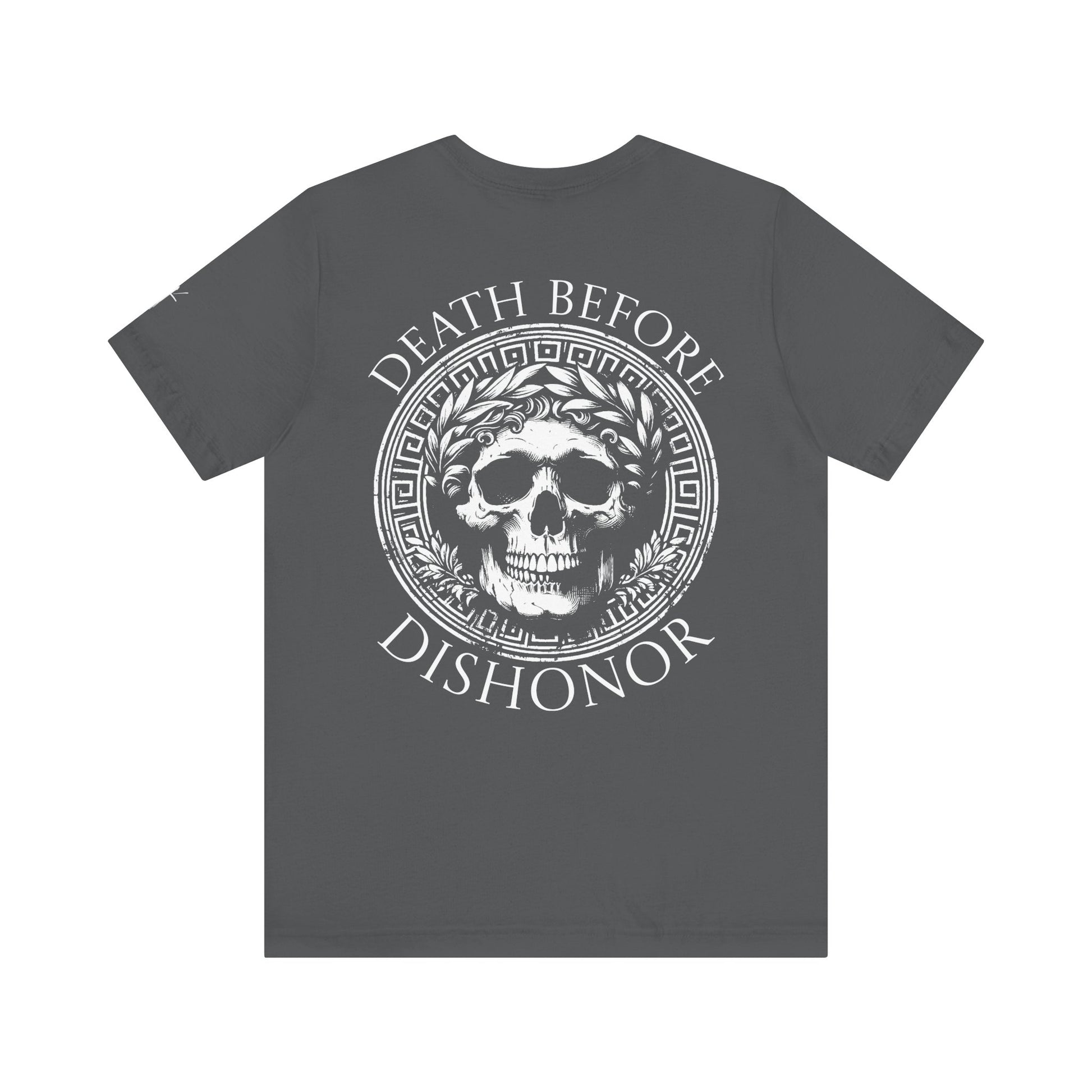 Stand firm in your code with the Death Before Dishonor T-shirt. Featuring a bold skull crest surrounded by laurel and ancient warrior detail, this design embodies strength, loyalty, and unbreakable honor.