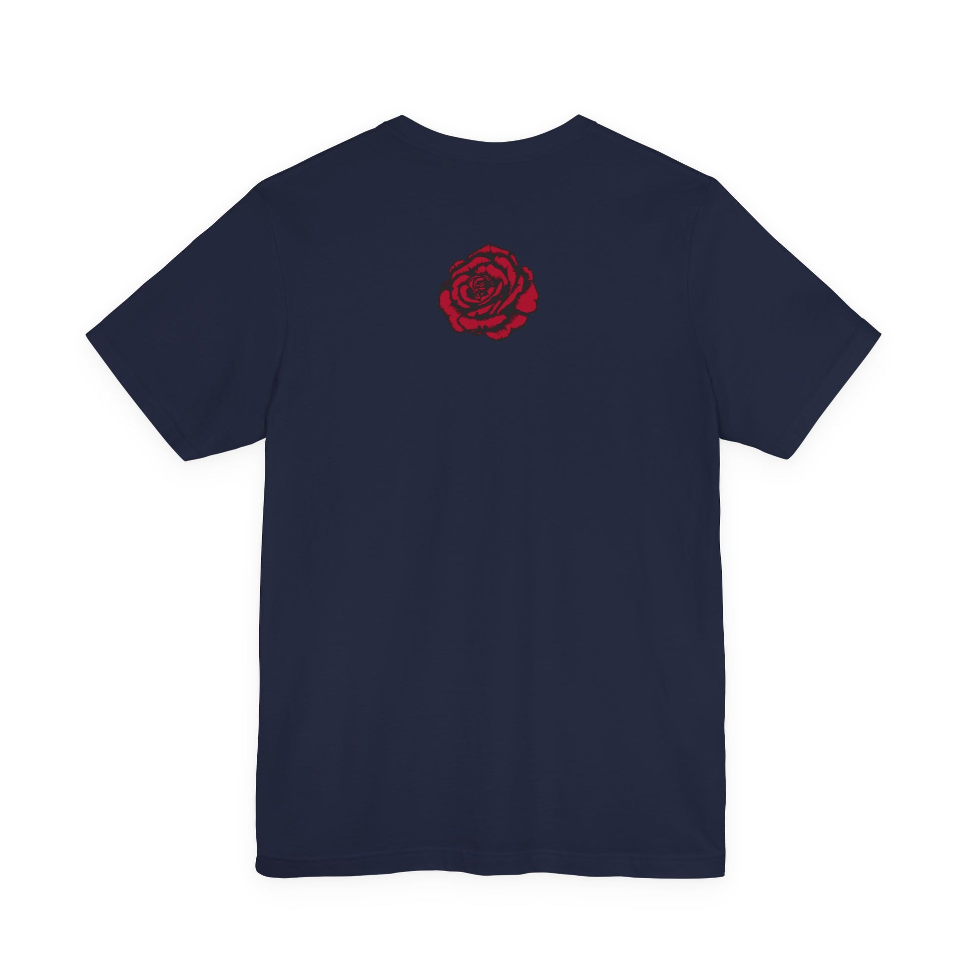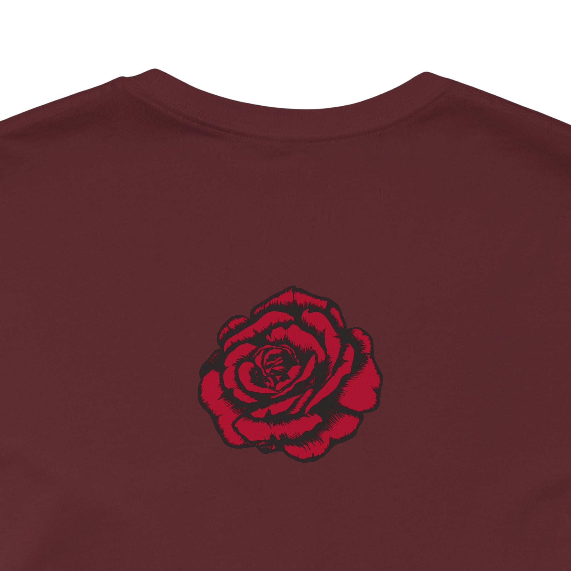 A skeletal hand clutches a living rose wrapped in a golden rosary — a reminder that faith endures even through the darkest moments. The red rose symbolizes divine love and rebirth, while the bones represent mortality and the courage to rise again.