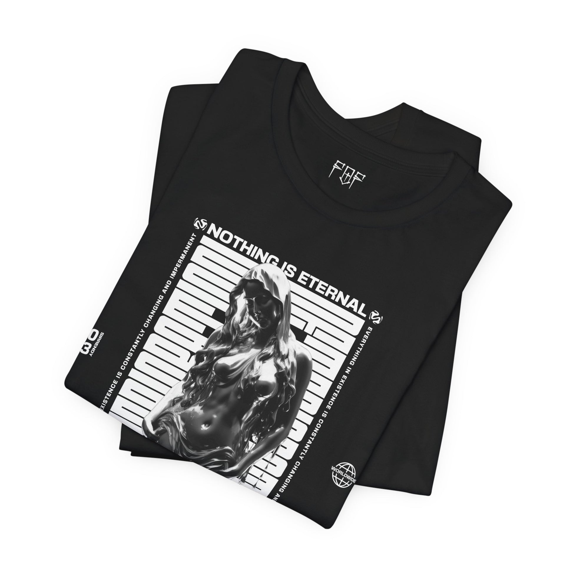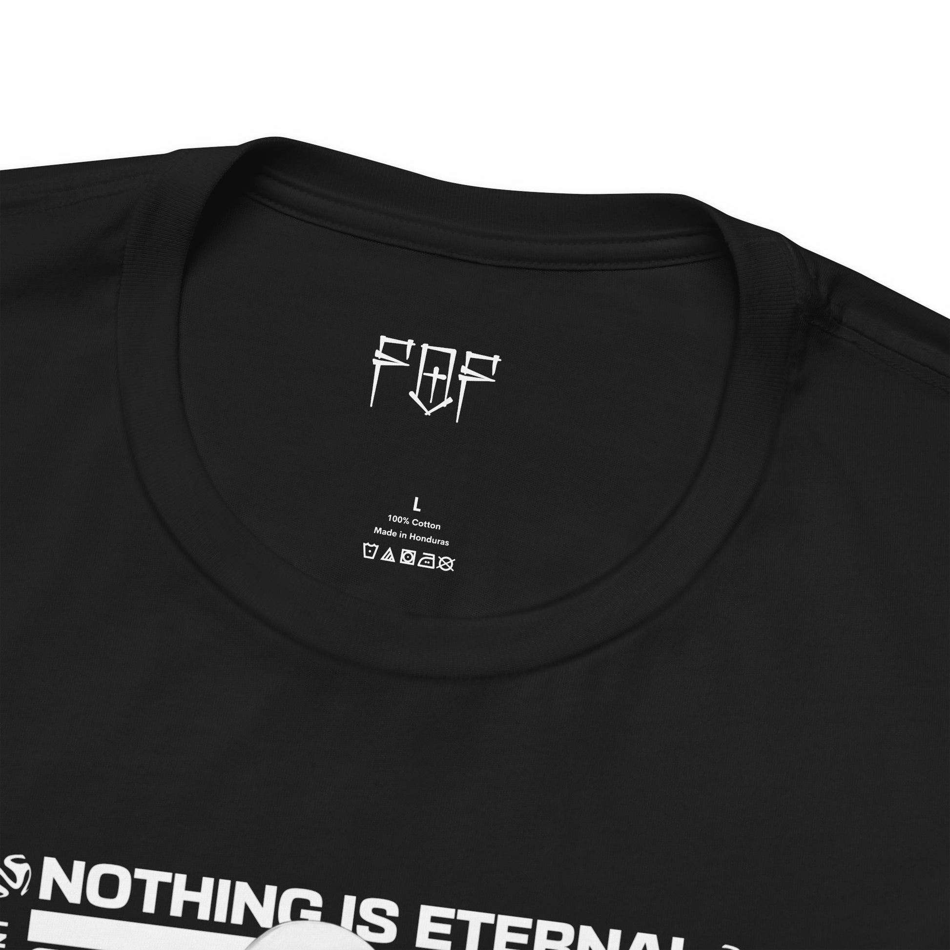 The “Nothing Is Eternal” headline and side text blocks give it a collectible feel, stamped with a 2023 mark to mark the moment. Branded with our signature Faith Over Fear emblem on the back neck, this tee stands as both a work of art and a declaration of mindset.